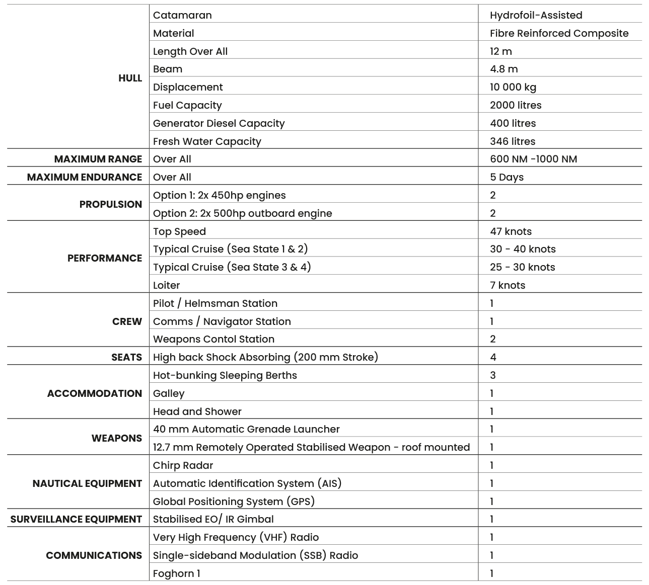 • Uniquely designed hydrofoil-assisted catamaran to enhance high-speed patrol and interception